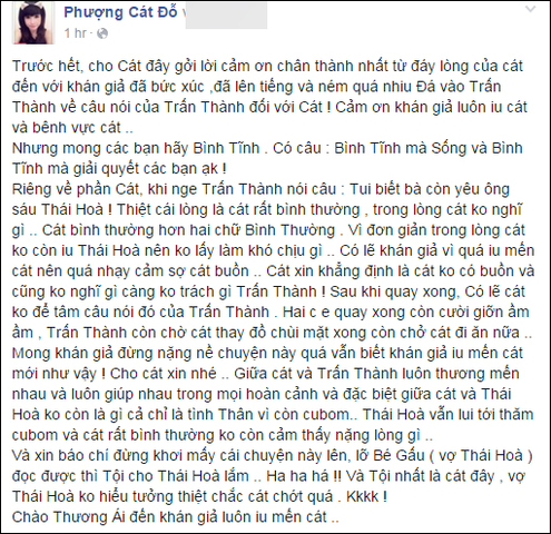 Trước phản ứng trái chiều của dư luận, Cát Phượng đã lên tiếng. Theo đó, cô khuyên khán giả nên bình tĩnh trước khi đưa ra những lời nhận xét mang tính “ném đá” nặng nề. Nữ diễn viên khẳng định, khi nghe câu “Tôi biết bà còn yêu ông Sáu Thái Hòa”, trong lòng cũng không nghĩ gì và cảm thấy rất bình thường, vì đơn giản cô không còn yêu Thái Hòa.